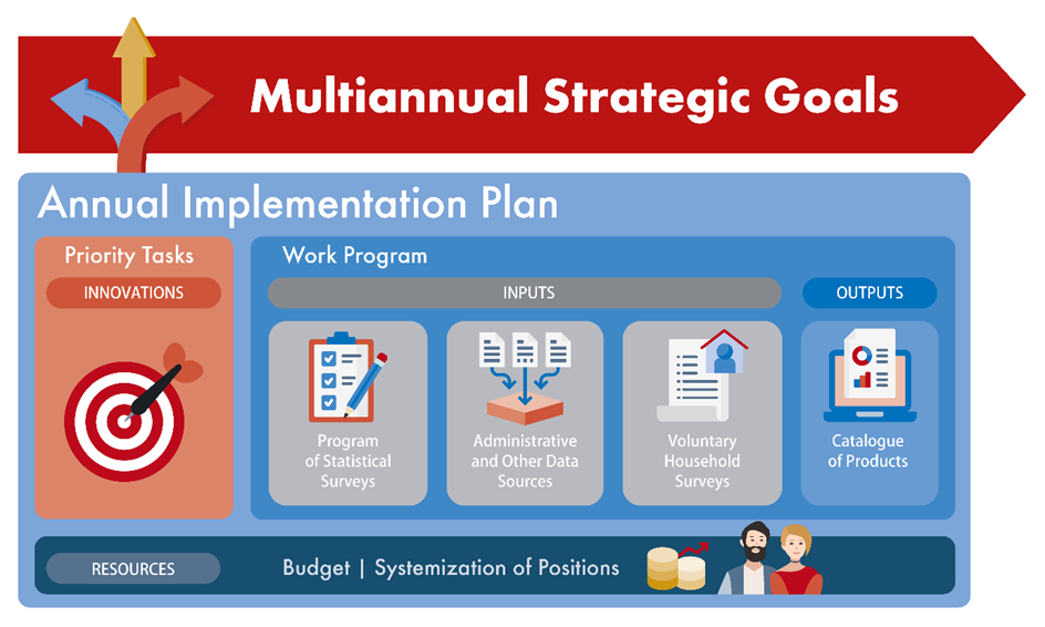 The office’s work program for the given year is compiled primarily based on the requirements of the European Statistical Program and other international as well as national requirements for official statistics. It includes the Catalogue of Products, including the related calendar of News Releases and other outputs for the year. It also comprises the program of statistical surveys, a plan for household surveys, and a plan for using data from administrative and other sources that provide necessary data inputs for statistics compilation.