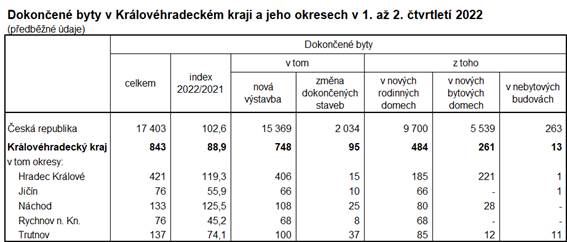 V průběhu 1. pololetí 2022 bylo v Královéhradeckém kraji dokončeno 843 bytů, proti stejnému období loňského roku to bylo o 105 bytů, tj. 11,1 % méně. Počet dokončených bytů tak řadí kraj na 8. příčku mezi čtrnácti kraji.
