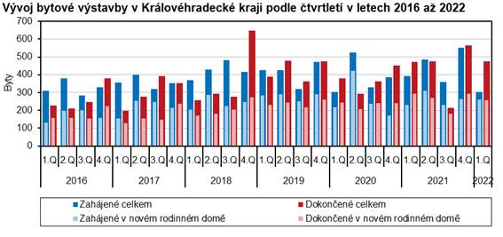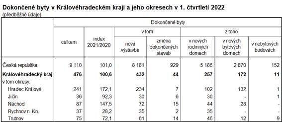 V průběhu 1. čtvrtletí 2022 bylo v Královéhradeckém kraji dokončeno 476 bytů, proti stejnému období loňského roku to bylo o tři byty více. Mezi čtrnácti kraji České republiky tak Královéhradecký kraj zaujal osmou příčku.