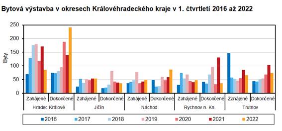 Z pěti okresů Královéhradeckého kraje došlo k meziročními nárůstu zahájených bytů ve třech z nich, nejvyšší byl v okrese Rychnov nad Kněžnou, a to pětinový. Naopak ve dvou nejlidnatějších okresech (Hradec Králové a Trutnov) došlo k výraznému meziročnímu propadu zahájených bytů (o 50,3 %, resp. o 22,4 %). V okrese Hradec Králové se na poklesu podílel fakt, že proti 1. čtvrtletí 2021 (67 bytů) nebyl zahájen žádný byt v novém bytovém domě a pokles u bytů v nových rodinných domech byl téměř pětinový (17,8 %). V okrese Trutnov byla sice zahájena výstavba v nových bytových domech v počtu 8 bytů, ale meziročně to představuje pokles o 20 bytů, tj. o 71,4 %.