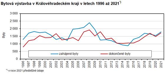 V celé České republice bylo v roce 2021 dokončeno celkem 34 622 bytů, proti roku 2020 to představuje mírný nárůst (o 210 bytů, tj. o 0,6 %). Ze čtrnácti krajů zaznamenalo osm meziroční nárůst a v šesti počty dokončených bytů klesly. Relativně nejvyšší nárůst, více než pětinový, vykázal Kraj Vysočina (20,2 %, tj. 314 bytů) a druhý nejvyšší byl v Královéhradeckém kraji (15,9 %, tj. o 237 bytů), v absolutním vyjádření přibylo nejvíc dokončených bytů v Jihomoravském kraji (337 bytů). Naopak nejvýraznější pokles byl v kraji Olomouckém (o 13,4 %, tj. o 296 bytů), Středočeském (o 6,6 %, tj. o 452 byty) a hl. městě Praze (o 4 %, tj. o 220 bytů). Dokončené byty v Královéhradeckém kraji tvořily 5 % z celkového počtu dokončených bytů v ČR a byl to šestý nejnižší podíl mezi kraji.