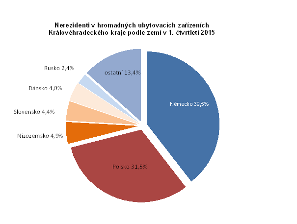Během prvních třech měsíců roku 2015 se ubytovalo v hromadných ubytovacích zařízeních Královéhradeckého kraje více než 282 tisíc hostů, což bylo o pětinu (o 50 tisíc hostů) více než ve stejném období roku 2014. Na nárůstu hostů se podíleli jak domácí tak i zahraniční hosté. Rezidenti (domácí hosté) tvořili 71,4 % z celkového počtu hostů a přijelo jich o 35 tisíc (o 21,1 %) více než v 1. čtvrtletí 2014. Nárůst zahraniční klientely (nerezidentů) byl ještě rychlejší (o 23,6 %) a představoval meziroční přírůstek 15 tisíc hostů. Do Královéhradeckého kraje zavítala necelá desetina (9,4 %) z celkového počtu všech hostů hromadných ubytovacích zařízení v České republice, z toho domácí hosté se podíleli na republikovém počtu 13,4 % a zahraniční 5,4 %.