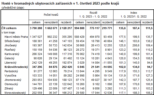 Na růstu se podíleli pouze zahraniční hosté (nerezidenti), kterých se ubytovalo o 21,5 tisíc, tj. o třetinu meziročně více, avšak téměř o pětinu méně než tomu bylo před čtyřmi lety. Rezidenti (domácí hosté) tvořili 75,6 % celkového počtu návštěvníků kraje a letos jich přijelo o 14,7 tisíc, tj. o 5,3 % méně než v 1. čtvrtletí 2022. Přesto byl jejich počet již druhým rokem vyšší než před pandemií, letos o 1,4 %.