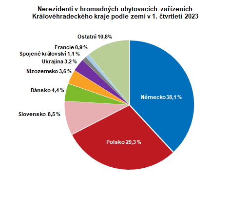 Nejčastějšími zahraničními hosty (podle státního občanství) Královéhradeckého kraje byli turisté z Německa (32,3 tisíc osob), kteří tvořili 38,1 % všech nerezidentů. Oproti 1. čtvrtletí 2022 jich přijelo o 11,4 tisíce více, tj. o 55,0 %. Nárůst nastal i u hostů ze sousedního Polska, kterých byl dle četnosti druhý nejvyšší počet (24,9 tisíc osob) a oproti loňskému 1. čtvrtletí jich přijelo o 5,0 tisíce více, tj. o čtvrtinu. Meziroční nárůst zaznamenali i hosté ze Slovenska (7,2 tisíc hostů), kterých se ubytovalo o 2,7 tisíc, tj. o 61,4 % více.