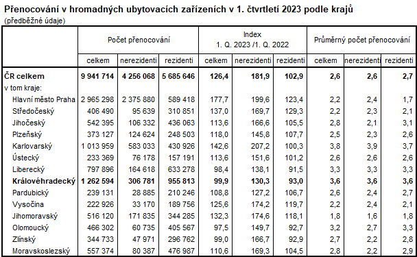Průměrná doba pobytu ve sledovaných zařízeních cestovního ruchu České republiky činila v 1. čtvrtletí letošního roku 2,6 noci, z toho cizinci 2,6 noci a domácí hosté 2,7 noci. V Královéhradeckém kraji pobývali hosté v průměru 3,6 noci na jeden pobyt a mezi kraji to byl druhý nejdelší pobyt za krajem Karlovarským. Cizinci i domácí hosté se ubytovali v kraji shodně v průměru na 3,6 noci.