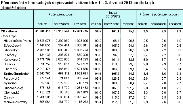 Průměrná doba přenocování v kraji byla 3,4 noci na jeden pobyt, tj. spolu s Libereckým krajem druhá nejdelší doba po kraji Karlovarském (5,9 noci), podobně tomu bylo u zahraničních hostů. Domácí klientela zaujala podle délky pobytu až čtvrté pořadí po kraji Libereckém, Olomouckém a Karlovarském. Nejkratší dobu přenocování vykázalo Hlavní město Praha (1,9 nocí). V průměru za Českou republiku byla délka přenocování shodně 2,9 nocí. V samotném 3. čtvrtletí 2013 dosáhl počet přenocování hostů v Královéhradeckém kraji víc než 1 mil. a propadl se tak proti loňské srovnatelné skutečnosti o 7,5 %, což je nejvíce mezi kraji. Na tomto poklesu se podíleli domácí návštěvníci snížením počtu přenocování o 10,5 %. Zahraniční hosté se v zařízeních kraje naopak zdrželi o 5,6 % déle. Více informací naleznete v Rychlých informacích a Časových řadách. |