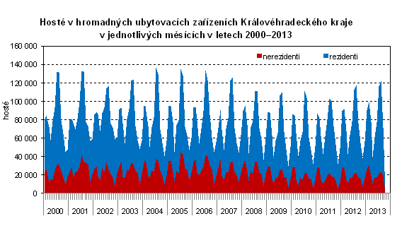 | Návštěvnost za devět měsíců letošního roku v kraji vzrostla meziročně o 16 tisíc hostů. Ubytovalo se více domácích i zahraničních hostů zhruba o 8 tisíc a s vyšší intenzitou u zahraničních návštěvníků. V samotném třetím čtvrtletí návštěvnost vzrostla o 4 tisíce hostů vlivem hostů z České republiky i ze zahraničí zejména z Německa a Polska. Podle předběžných výsledků se v průběhu devíti měsíců letošního roku v hromadných ubytovacích zařízeních Královéhradeckého kraje ubytovalo 755 tis. hostů, tj. o 2,2 % více než ve srovnatelném období loňského roku a nad celorepublikovým průměrem (1,1 %). Tři čtvrtiny hostů tvořili domácí turisté (rezidenti), kterých přijelo o 1,4 % více. Zahraničních hostů (nerezidentů) pak přijelo o 4,8 % více. V zařízeních Královéhradeckého kraje se od ledna do září ubytoval čtvrtý největší počet hostů po Hl. městě Praha, Jihomoravském a Jihočeském kraji, což představovalo 6,9 % hostů České republiky. Přitom u domácích hostů to byl po Jihočeském a Jihomoravském kraji třetí největší počet a u zahraničních hostů až páté pořadí. Srovnáme-li intenzitu meziročního vývoje, tak mezi kraji největší meziroční nárůst hostů měl kraj Olomoucký, náš kraj se umístil až na 7. pozici.