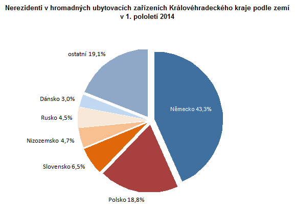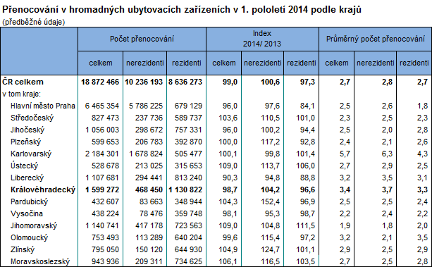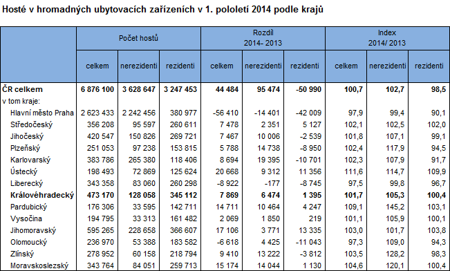 | Mírný nárůst hostů v 1. pololetí letošního roku díky přílivu hostů v druhém čtvrtletí a to jak z tuzemska tak ze zahraničí. Podle předběžných výsledků za cestovní ruch se v hromadných ubytovacích zařízeních Královéhradeckého kraje ubytovalo v 1. pololetí letošního roku celkem 473 tis. hostů, tj. o 7 869 hostů (o 1,7 %) více než ve stejném období loňského roku. Meziroční tempo růstu hostů bylo o procento vyšší než průměr za ČR (100,7 %). Domácí hosté (rezidenti) tvořili téměř tři čtvrtiny (72,9 %) hostů hromadných ubytovacích zařízení v kraji a přijelo jich o 0,4 % (tj. o 1 395 osob) více než v 1. pololetí 2013. Meziroční nárůst hostů ze zahraniční (nerezidentů) byl výrazně vyšší (o 5,3 %, tj. o 6 474 osob) a z celkového počtu hostů tvořili 27,1 %. Královéhradecký kraj navštívilo 6,9 % z celkového počtu hostů hromadných ubytovacích zařízení v ČR, domácí klienti se podíleli na celorepublikovém počtu 10,6 % a zahraniční 3,5 %. V zařízeních Královéhradeckého kraje se v období leden–červen ubytoval třetí nejvyšší počet hostů po Hl. městě Praha a Jihomoravském kraji, stejné pořadí bylo i u domácích hostů. Počet zahraničních hostů v našem kraji byl pátý nejvyšší po Hl. městě Praha, Karlovarském, Jihomoravském a Jihočeském kraji.