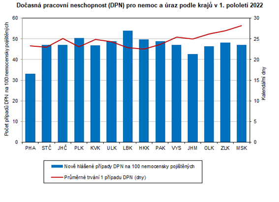 Během prvních šesti měsíců roku 2022 bylo nově hlášeno 105 102 případů dočasné pracovní neschopnosti, v porovnání se stejným obdobím roku 2021 se počet nově hlášených případů zvýšil o 40,0 %, tj. o 30 tisíc případů. Pro nemoc bylo hlášeno 99 391 případů, tj. 94,6 %, pro pracovní úrazy bylo hlášeno 1 266 případů, tj. 1,2 %, nově hlášených 4 445 případů, tj. 4,2 %, bylo hlášeno pro ostatní úraz. Z hlediska meziokresního srovnání se na celkovém počtu nově hlášených případů dočasné pracovní neschopnosti nejvíce podílel okres Hradec Králové (více než jedna třetina všech nově hlášených případů), nejméně okres Jičín (13,1 % nově hlášených případů).
