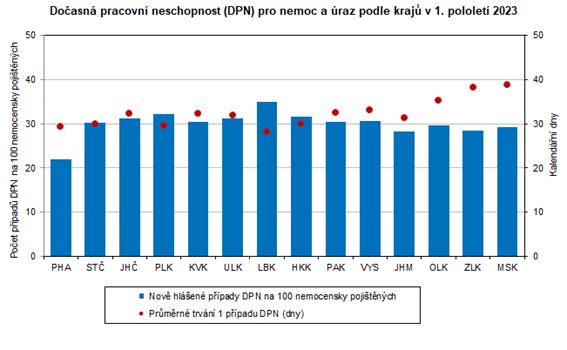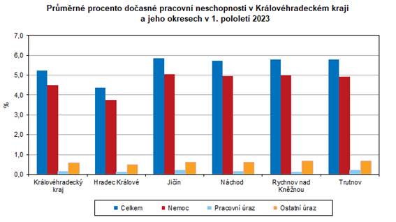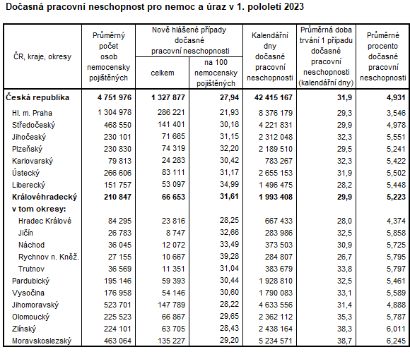 Během prvních šesti měsíců 2023 bylo nově hlášeno 66 653 případů dočasné pracovní neschopnosti, z toho 35 336 případů, tj. 53,0 % u žen. V porovnání se stejným obdobím roku 2022 počet nově hlášených případů poklesl o 36,6 %, tj. o 38 449 případů. Pro nemoc bylo hlášeno 61 266 případů, tj. 91,9 % všech nových případů, pro pracovní úrazy bylo hlášeno 1 161 případů, tj. 1,7 %, pro ostatní úrazy 4 226 případů, tj. 6,3 %. Z hlediska meziokresního srovnání se na celkovém počtu nově hlášených případů dočasné pracovní neschopnosti nejvíce podílel okres Hradec Králové (více než jedna třetina všech nově hlášených případů), nejnižší podíl byl zaznamenán v okrese Jičín (13,1 %).