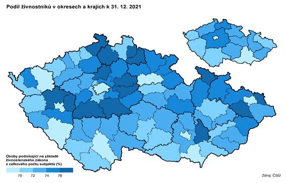Nejvyšší zastoupení živnostníků mezi okresy evidujeme v okrese Náchod (75,8 %, což je 18. nejvyšší hodnota mezi všemi okresy v ČR). V okresech Trutnov a Rychnov nad Kněžnou byl podíl živnostníků mezi subjekty 75,0 %, resp. 74,9 %. V okrese Jičín dosáhl jejich podíl 74,7 %, nejnižší hodnoty dosáhl okrese Hradec Králové, kde by jejich podíl pouze 69,4 %.