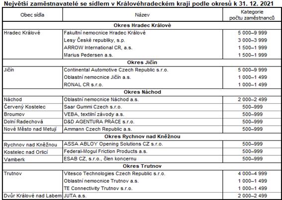Přehled největších zaměstnavatelů se sídlem v Královéhradeckém kraji, který je uveden v tabulce, je řazen v rámci jednotlivých okresů a podle kategorie počtu zaměstnanců, kde v rámci jedné obce jsou dále zaměstnavatelé řazeni abecedně dle názvu.