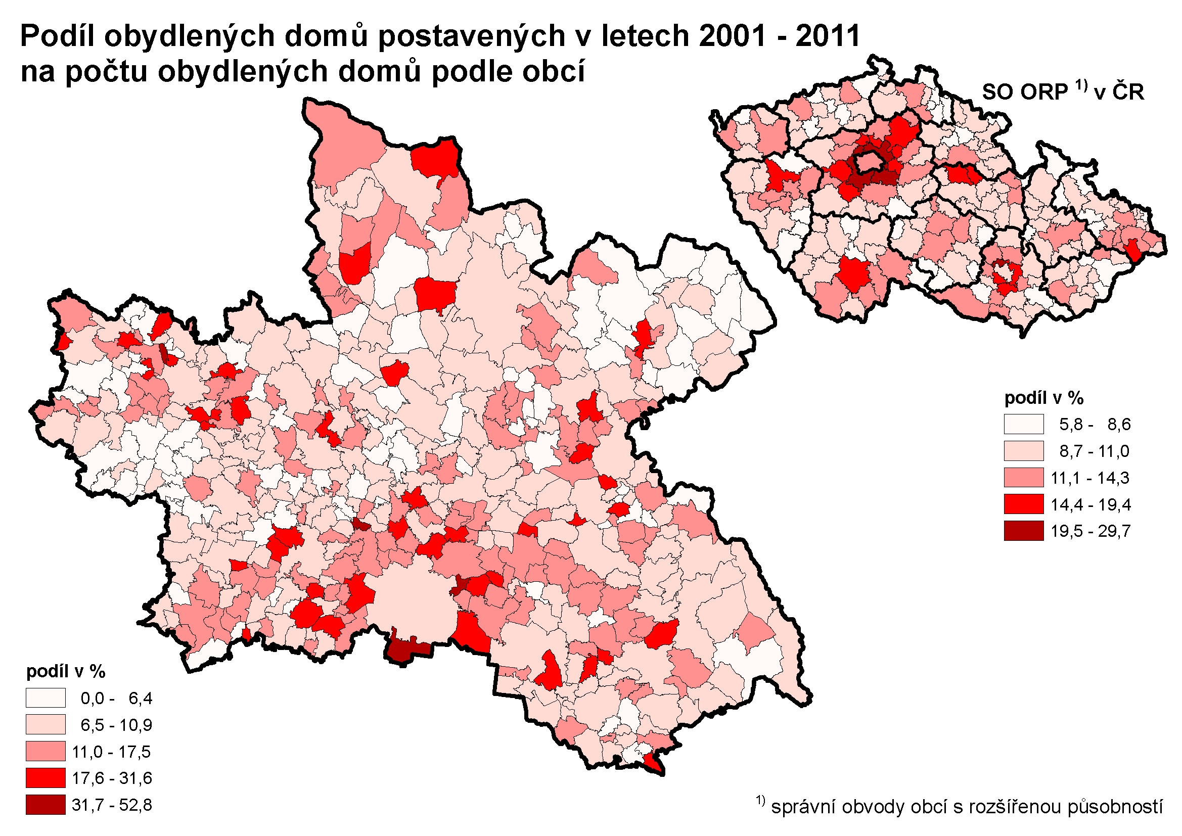 Podíl obydlených domů postavených v letech 2001 - 2011 na počtu obydlených domů podle obcí