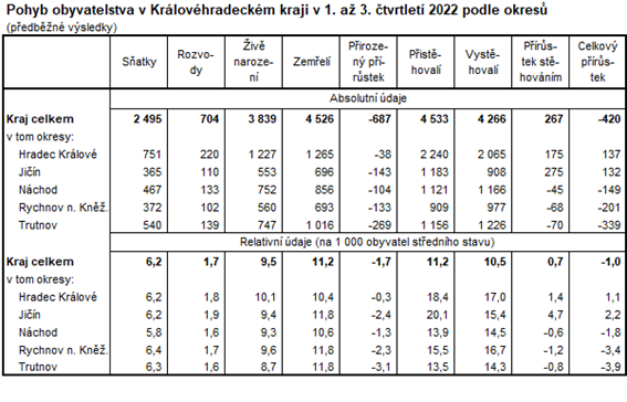 V prvních třech čtvrtletích v kraji celkově ubylo 420 obyvatel, zatímco ve srovnatelném období roku 2021 byl v kraji zaznamenán celkový úbytek 1 534 osob. Počet obyvatel se snížil ve třech okresech kraje, celkový přírůstek byl evidován pouze v okresech Hradec Králové a Jičín. Absolutně i relativně ubylo nejvíce obyvatel v okrese Trutnov (úbytek 339 osob, tj. 3,9 ‰).