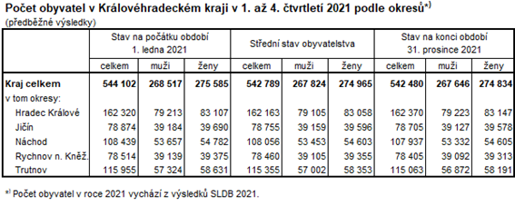 Ke konci roku 2021 v kraji celkově ubylo obyvatel, celkový úbytek činil 1 622 osob, celkový pokles obyvatel byl zaznamenán i v roce 2020 (úbytek 844 osob). Počet obyvatel se zvýšil pouze v okrese Hradec Králové, celkový úbytek obyvatel měly zbývající čtyři okresy kraje, nejvyšší okresy Trutnov (úbytek 892 obyvatel, tj. 7,7 ‰) a Náchod (úbytek 502 obyvatel, tj. 4,6 ‰).
