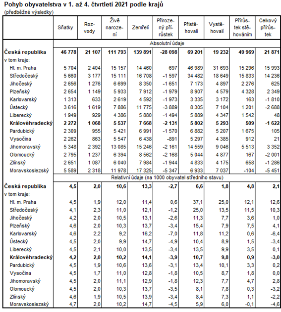 V pořadí přirozených přírůstků obyvatel Královéhradecký kraj s relativním úbytkem 3,9 ‰ obsadil jedenácté místo, kladný přirozený přírůstek obyvatel byl zaznamenán pouze v hl. m. Praze (0,6 ‰). Nejvyšší úbytek obyvatel přirozenou měnou měl v roce 2021 Karlovarský kraj (úbytek 7,0 ‰). V pořadí krajů z hlediska relativního přírůstku obyvatel stěhováním zaujal Královéhradecký kraj opět jedenácté místo (přírůstek 0,9 ‰), hl. m. Praha s přírůstkem 12,1 ‰ první místo. Relativní úbytek obyvatel v důsledku stěhování byl zaznamenán pouze v Moravskoslezském kraji, kde migrační úbytek dosáhl ve sledovaném období hodnoty -0,1 ‰. Při porovnání celkových relativních přírůstků se Královéhradecký kraj s hodnotou -3,0 ‰ umístil na desátém místě, nejvyšší celkový přírůstek mělo hl. m. Praha (12,6 ‰), nejvyšší celkový úbytek obyvatel byl v roce 2021 zaznamenán v Karlovarském kraji (úbytek 6,4 ‰). Celkově přibylo obyvatel v osmi ze čtrnácti krajů, v České republice celkově přibylo 21 871 obyvatel, osob, relativně 2,1 ‰.
