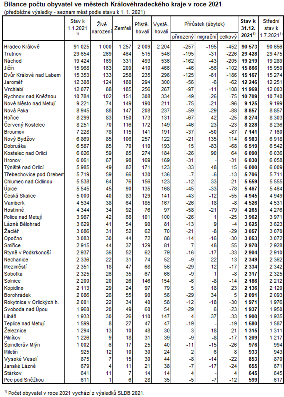 Počet obyvatel v kraji v průběhu roku 2021 klesl o 1 622 osob. Počet zemřelých, přirozený i celkový úbytek obyvatel byl v celém sledovaném období 1990 až 2021 nejvyšší. Meziročně ubylo celkově obyvatel v 37 městech ze 48 měst kraje, nejvíce v krajském městě Hradec Králové.