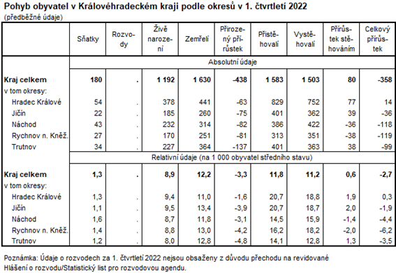 V prvním čtvrtletí v kraji celkově ubylo 358 obyvatel, zatímco ve srovnatelném období roku 2021 byl v kraji zaznamenán celkový úbytek 1 375 osob. Počet obyvatel se snížil ve čtyřech okresech kraje, celkový přírůstek byl evidován pouze v okrese Hradec Králové. Absolutně i relativně ubylo nejvíce obyvatel v okrese Rychnov nad Kněžnou (119 osob, tj. 6,2 ‰).
