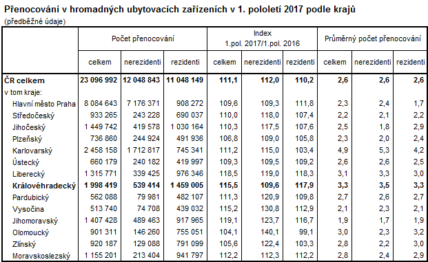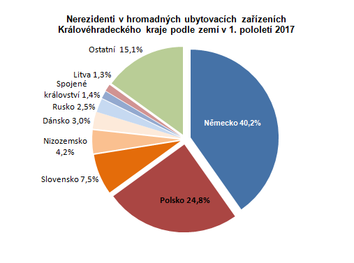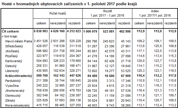Během prvních šesti měsíců letošního roku se v hromadných ubytovacích zařízeních Královéhradeckého kraje ubytovalo 599,8 tisíc hostů, což bylo o 84 tisíc hostů více než ve stejném období roku 2016. Na nárůstu se podíleli jak domácí tak i zahraniční hosté. Rezidenti (domácí hosté) tvořili 74,6 % z celkového počtu hostů a přijelo jich o 68 tisíc (o 17,9 %) více než v 1. pololetí 2016. Nárůst zahraniční klientely (nerezidentů) byl nižší (o 12,2 %) a představoval meziroční přírůstek 16,6 tisíc hostů. Do Královéhradeckého kraje zavítalo 6,8 % hostů z celkového počtu všech hostů hromadných ubytovacích zařízení v České republice, z toho domácí hosté se podíleli na republikovém počtu 10,6 % a zahraniční 3,3 %.