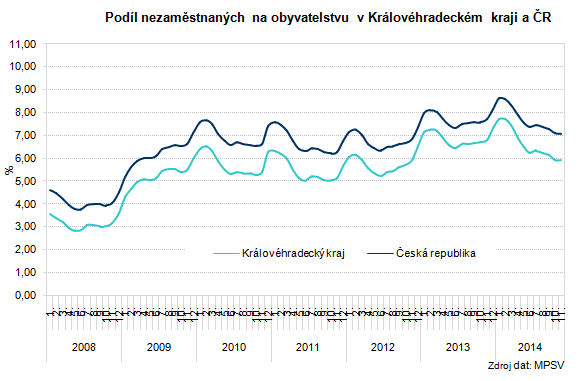Podíl nezaměstnaných v kraji zůstal na úrovni měsíce října a činil 5,93 %. Podíl nezaměstnaných žen dosáhl6,20 % a byl o 0,53 p.b. vyšší než u mužů (5,67 %). V celé České republice představoval podíl dosažitelných uchazečů o zaměstnání v měsíci listopadu 7,09 % (muži 6,81 %, ženy 7,38 %) a proti Královéhradeckému kraji byl o 1,16 p.b. vyšší.