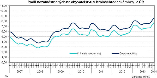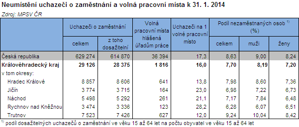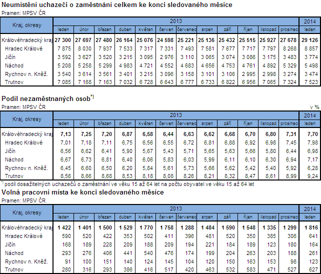 Podíl nezaměstnaných osob ve věku 15 až 64 let na počtu obyvatel stejného věku vzrostl proti prosinci 2013 o 0,39 p.b. na 7,70 %. Podíl nezaměstnaných žen v kraji (7,20 %) byl o 1 procentní bod nižší než u mužů (8,19 %). Průměrný podíl nezaměstnaných v České republice byl oproti našemu kraji vyšší o 0,92 p.b. (celkem 8,63 %; muži 9,00 %, ženy 8,24 %). V porovnání s ostatními regiony byl v Královéhradeckém kraji čtvrtý nejnižší podíl nezaměstnaných po Hl. městě Praha, Plzeňském a Středočeském kraji. Ve třech krajích vyskočila nezaměstnanost do dvouciferných čísel (Ústecký kraj 11,93 %, Moravskoslezský kraj 10,92 % a Olomoucký kraj 10,48 %). Z hlediska okresů Královéhradeckého kraje vykazuje dlouhodobě nejvyšší nezaměstnanost okres Trutnov (9,24 %), mezi 77 okresy v České republice to představuje 30. příčku. Naopak nejnižší nezaměstnanost v kraji se pátý měsíc drží v okrese Rychnov nad Kněžnou (6,28 %) a mezi okresy v celé republice to představuje 9. nejnižší úroveň nezaměstnanosti. Ke konci ledna evidovaly úřady práce celkem 1 816 volných pracovních míst, proti konci roku 2013 jejich počet vzrostl o 517 míst, tj. o 39,8 %. Na jedno volné pracovní místo v kraji připadlo v průměru 16 uchazečů. Mezi okresy byly výrazné rozdíly, zatímco v okrese Trutnov to bylo 12 uchazečů v okrese Rychnov nad Kněžnou připadlo 28,2 uchazečů na jedno volné pracovní místo. Ke konci ledna pobíralo v kraji 8 022 uchazečů o zaměstnání podporu v nezaměstnanosti, tj. 27,5 % z celkového počtu nezaměstnaných. Částečně nezaměstnaný byl každý patnáctý uchazeč (1 890 osob), z nich ženy tvořily více než dvě třetiny (1 270 žen).