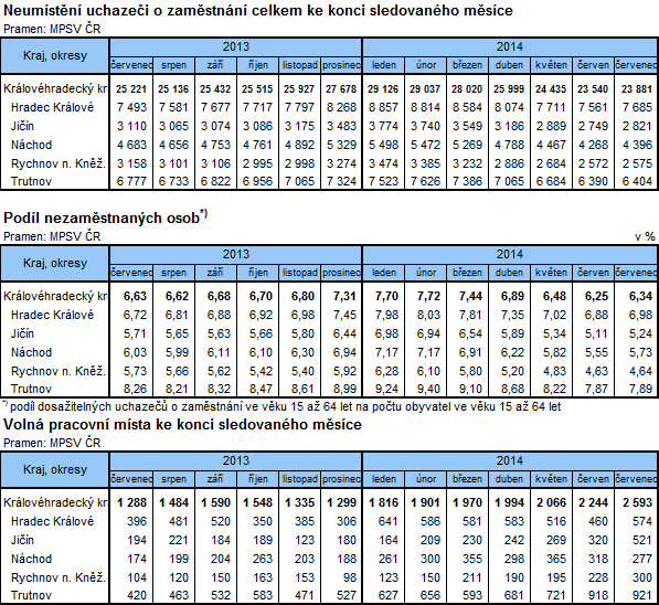 | Po čtyřech měsících počet nezaměstnaných i jejich podíl na obyvatelstvu ve věku 15–64 let meziměsíčně opět vzrostly, shodně o 1,4 %. Úřady práce Královéhradeckého kraje evidovaly ke konci července celkem 23 881 uchazečů o zaměstnání, tj. o 341 osob (o 1,4 %) více než ke konci června. K meziměsíčnímu nárůstu nezaměstnaných došlo ve všech okresech kraje, nejvyšší byl v okrese Náchod (o 128 nezaměstnaných, tj. o 3 %). Oproti stejnému období loňského roku uchazečů o zaměstnání v kraji ubylo, celkem o 1 340 osob, tj. o 5,3 %. Meziroční pokles nezaměstnaných zaznamenaly všechny okresy kraje s výjimkou okresu Hradec Králové, kde došlo k nárůstu o 192 uchazečů, tj. o 2,6 %. Nejvýraznější meziroční pokles nezaměstnaných zaznamenal okres Rychnov nad Kněžnou (o 583 osob, tj. o 18,5 %). V prvním prázdninovém měsíci přibylo na úřadech práce Královéhradeckého kraje celkem 2 839 nových uchazečů o zaměstnání, nejvíc v okrese Hradec Králové (29,8 % z celkového počtu nově hlášených uchazečů). Noví uchazeči se podíleli na celkovém počtu nezaměstnaných v kraji 11,9 %, jejich podíl meziročně vzrostl o 1,6 p.b.