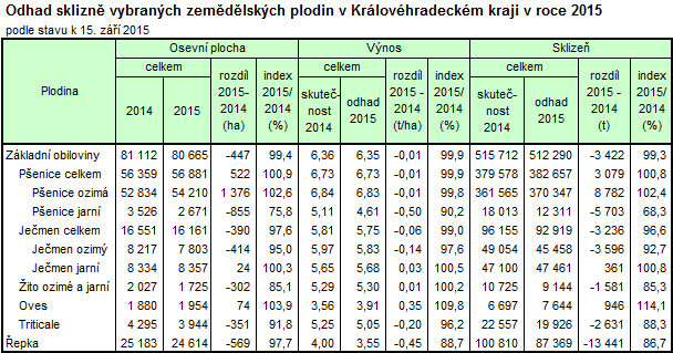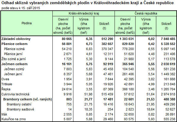 Na základě zjišťování k 15. září 2015 se odhaduje v Královéhradeckém kraji sklizeň obilovin (základní obiloviny a kukuřice na zrno, bez ostatních obilovin) ve výši 512 tis. tun při průměrném výnosu 6,35 t/ha. Proti skutečnosti roku 2014 to znamená snížení sklizně o 3,4 tis. tun (tj. o 0,7 %) a hektarového výnosu o 0,01 t/ha (tj. o 0,1 %). Odhadovaná sklizeň kukuřice na zrno ve výši 29,5 tis. tun je ve srovnání s loňskou sklizní o více než třetinu nižší (tj. o 17,9 tis. tun, o 37,8 %).