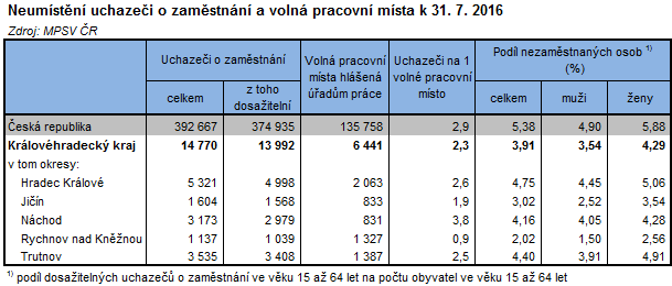 Podíl nezaměstnaných osob v kraji proti červnu mírně vzrostl na 3,91 %. Podíl nezaměstnaných mužů (3,54 %) byl o 0,75 p.b. nižší než u žen (4,29 %). Nezaměstnanost v České republice dosáhla hodnoty 5,38 % (muži 4,90 %, ženy 5,88 %) a proti Královéhradeckému kraji byla o 1,47 p.b. vyšší.