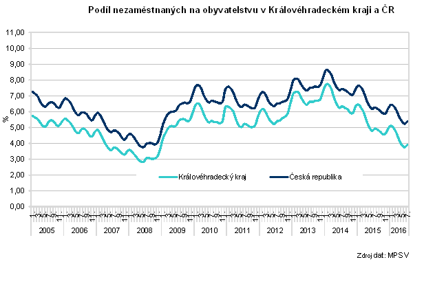 Královéhradecký kraj se řadí k regionům s nejnižší nezaměstnaností v České republice. V měsíci červenci byla nižší nezaměstnanost jen v Plzeňském kraji (3,83 %) a v Hl. městě Praze byl shodný podíl nezaměstnaných (3,91 %) jako v našem kraji. Naopak s nejvyšší nezaměstnaností se dlouhodobě potýkají regiony na severu Čech a Moravy. Nezaměstnanost v Ústeckém kraji byla v červenci 8,34 % a v Moravskoslezském kraji 7,76 % a to bylo nejvíc ze všech krajů.