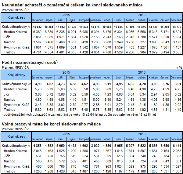 V porovnání se stejným obdobím loňského roku (červenec 2015) bylo v kraji o pětinu nezaměstnaných méně, tj. o 3 782 osob. Meziročně nejvyšší pokles byl v absolutním vyjádření v okrese Trutnov (o 1 166 uchazečů o zaměstnání méně), v relativním vyjádření v okrese Rychnov nad Kněžnou (o 40,2 %).