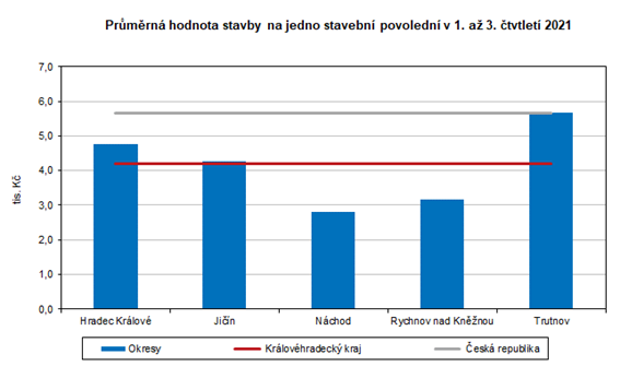 Průměrná hodnota na jedno stavební povolení v 1. až 3. čtvrtletí 2021 činila 4 189 tis. Kč, přičemž vyšší byla v okresech Trutnov, Hradec Králové a Jičín. Ve srovnání s republikovým průměrem byla nižší o 1 466 tis. Kč a v mezikrajském srovnání byla 4. nejvyšší. Maxima bylo tradičně dosaženo v hl. městě Praze (35 744 tis. Kč.), naopak nejnižší hodnota byla v Ústeckém kraji (3 021 tis. Kč).