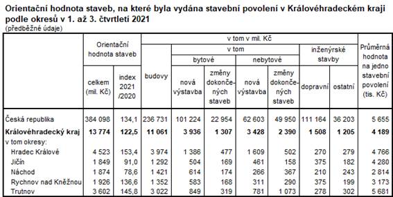 Stavební úřady v Královéhradeckém kraji vydaly v průběhu 1. až 3. čtvrtletí 2021 celkem 3 288 stavebních povolení, z toho třetina připadla na nové budovy. Předpokládaná hodnota všech povolených staveb v kraji činila 13,8 mld. Kč a oproti stejnému období předchozího roku se zvýšila o 22,5 %.
