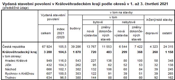 V průběhu tří čtvrtletí roku 2021 vydaly stavebními úřady Královéhradeckého kraje podle předběžných údajů 3 288 stavebních povolení, což bylo meziročně o 143 povolení více, tj. o 4,5 %. Nárůst počtu vydaných stavebních povolení byl v rámci kraje zaznamenán ve všech okresech s výjimkou okresu Trutnov, ve kterém byl zaznamenán pokles o 3,5 %. Nejvýraznější meziroční nárůst počtu vydaných stavebních povolení byl zaznamenán v okresech Hradec Králové (o 16 %) a Jičín (o 4,3 %). V okresech Náchod a Rychnov nad Kněžnou došlo k nárůstu o 2,1 %, resp. 0,5 %.