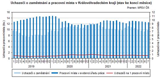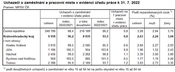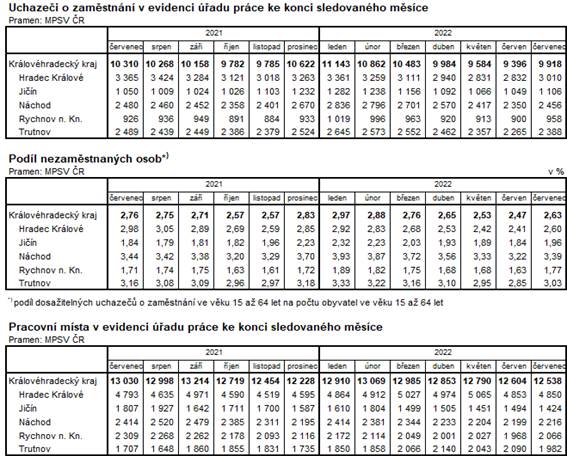 Úřady práce Královéhradeckého kraje evidovaly k 31. 7. 2022 celkem 9 918 uchazečů o zaměstnání, tj. meziměsíční nárůst o 522 osob. Obdobný trend byl zaznamenán ve všech okresech kraje. V porovnání s minulým měsícem vykazovaly nejvýraznější nárůst počtu uchazečů o zaměstnání okresy Hradec Králové (o 178 osob, tj. o 6,3 %), Trutnov (o 123 osob, tj. o 5,4 %) a Náchod (o 106 osob, tj. o 4,5 %).