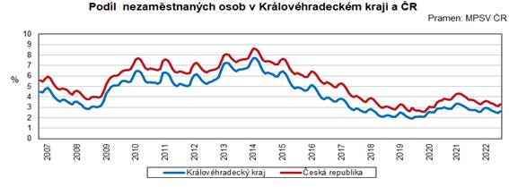 Podíl nezaměstnaných osob v Královéhradeckém kraji meziměsíčně klesl a dosáhl hodnoty 2,63 %. Ve srovnání s průměrem celé ČR byl o 0,65 procentního bodu nižší. Z genderového pohledu tento ukazatel zaznamenal vyšší nezaměstnanost u žen než u mužů, podíl nezaměstnaných žen měl hodnotu 3,04 % a u mužů 2,24 %.