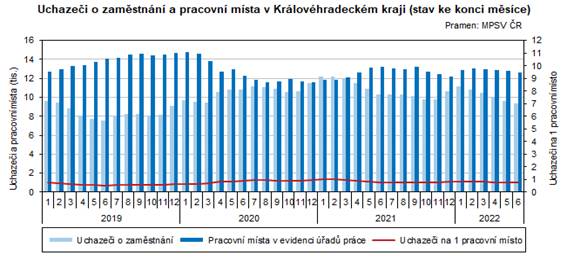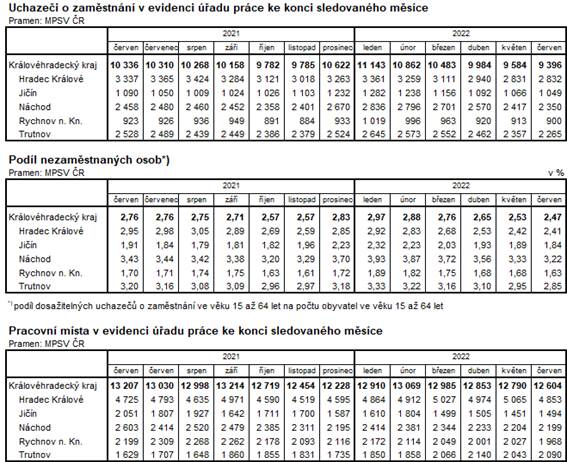 Ve srovnání s červnem loňského roku se počet uchazečů o zaměstnání v kraji snížil o 9,1 %. Meziroční pokles byl zaznamenán ve všech okresech kraje, nejvýraznější byl v okresech Hradec Králové (o 505 osob, tj. o 15,1 %), Trutnov (o 263 osob, tj. o 10,4 %) a Náchod (o 108 osob, tj. o 4,4 %). V okresech Jičín a Rychnov nad Kněžnou byl pokles o 41 osob (o 3,8 %), resp. o 23 osob (o 2,5 %).
