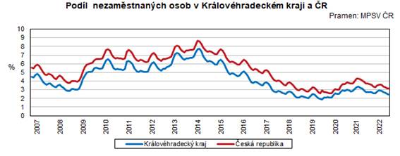 Podíl nezaměstnaných osob v Královéhradeckém kraji meziměsíčně klesl a dosáhl hodnoty 2,47 %. Ve srovnání s průměrem celé ČR byl o 0,66 procentního bodu nižší. Z genderového pohledu tento ukazatel zaznamenal vyšší nezaměstnanost u žen než u mužů, podíl nezaměstnaných žen měl hodnotu 2,78 % a u mužů 2,18 %.
