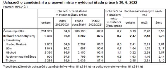 Úřady práce Královéhradeckého kraje evidovaly k 30. 6. 2022 celkem 9 396 uchazečů o zaměstnání, tj. meziměsíční pokles o 188 osob. Obdobný trend byl zaznamenán ve všech okresech kraje s výjimkou okresu Hradec Králové, ve kterém evidujeme nárůst počtu uchazečů o 1 osobu. V porovnání s minulým měsícem vykazovaly nejvýraznější pokles počtu uchazečů o zaměstnání okresy Trutnov (o 92 osob, tj. o 3,9 %) a Náchod (o 67 osob, tj. o 2,8 %).