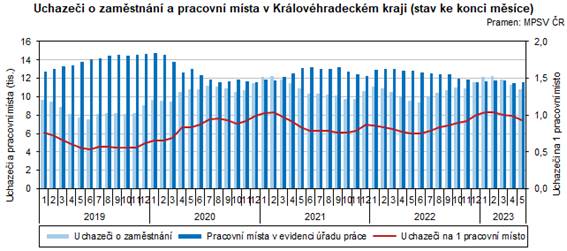 Úřady práce Královéhradeckého kraje evidovaly k 31. 5. 2023 celkem 10 842 uchazečů o zaměstnání. Meziměsíčně jejich počet klesl o 4,0 %, tj. o 449 osob. Podobný trend byl zřejmý ve všech okresech. V porovnání s minulým měsícem zaznamenaly nejvýraznější pokles okresy Náchod (o 5,9 %, tj. o 174 osob) a Trutnov (o 4,4 %, tj. o 122 osob).