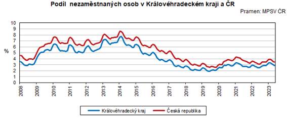 Podíl nezaměstnaných osob v Královéhradeckém kraji meziměsíčně klesl o 0,13 p. b. a dosáhl hodnoty 2,90 %. Ve srovnání s průměrem celé ČR byl o 0,56 procentního bodu nižší. Oproti konci května 2022 byl nárůst nezaměstnanosti o 0,37 p. b. Z genderového pohledu tento ukazatel zaznamenal vyšší nezaměstnanost u žen než u mužů, podíl nezaměstnaných žen měl hodnotu 3,31 % a u mužů 2,50 %.