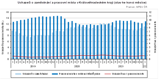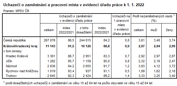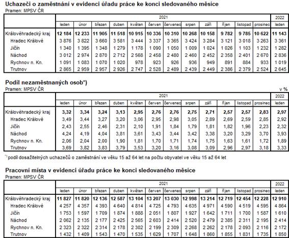 Úřady práce Královéhradeckého kraje evidovaly k 31. 1. 2022 celkem 11 143 uchazečů o zaměstnání, tj. meziměsíční nárůst o 521 osob. Obdobný trend byl zaznamenán ve všech okresech kraje, v porovnání s minulým měsícem vykazovaly nejvýraznější relativní nárůst počtu uchazečů o zaměstnání okresy Rychnov nad Kněžnou (o 9,2 %, tj. o 86 osob) a Náchod (o 6,2 %, tj. o 166 osob). Naopak nejméně uchazečů o zaměstnání přibylo v okrese Hradec Králové (o 3,0 %, tj. o 98 osob) a Jičín (o 4,1 %, tj. o 50 osob).