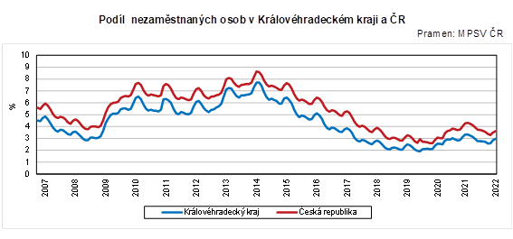 Podíl nezaměstnaných osob v Královéhradeckém kraji meziměsíčně vzrostl a dosáhl hodnoty 2,97 %. Ve srovnání s průměrem celé ČR byl o 0,64 procentního bodu nižší. Z genderového pohledu tento ukazatel zaznamenal vyšší nezaměstnanost u žen než mužů, podíl nezaměstnaných osob u žen měl hodnotu 2,99 % a u mužů 2,94 %.