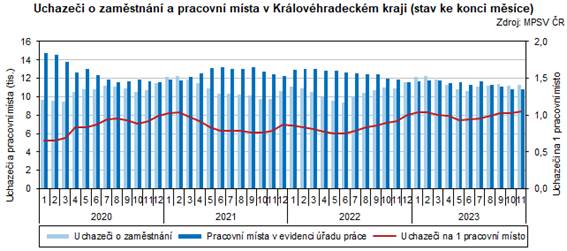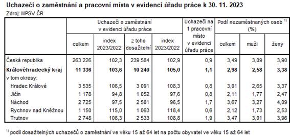 Úřady práce Královéhradeckého kraje evidovaly k 30. 11. 2023 celkem 11 336 uchazečů o zaměstnání, tj. o 1,4 % (o 161 osob) více než na konci minulého měsíce. Podobně tomu bylo v meziměsíčním srovnání ve všech okresech kraje, kromě okresu Jičín, kde počet uchazečů stagnoval. Nejvýraznější nárůst počtu uchazečů o zaměstnání zaznamenal okres Náchod (o 2,7 %, tj. o 72 osob).