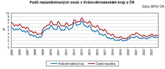 Podíl nezaměstnaných osob v Královéhradeckém kraji se meziměsíčně zvýšil o 0,04 p. b. a dosáhl hodnoty 2,98 %, což znamenalo čtvrtou nejnižší hodnotu v kraji za posledních 12 měsíců. Ve srovnání s průměrem celé ČR byl o 0,51 p. b. nižší. Oproti konci listopadu 2022 evidujeme nárůst nezaměstnanosti o 0,07 p. b. Z genderového pohledu tento ukazatel zaznamenal vyšší nezaměstnanost u žen než u mužů, podíl nezaměstnaných žen měl hodnotu 3,38 % a u mužů 2,58 %.