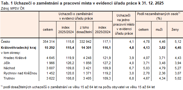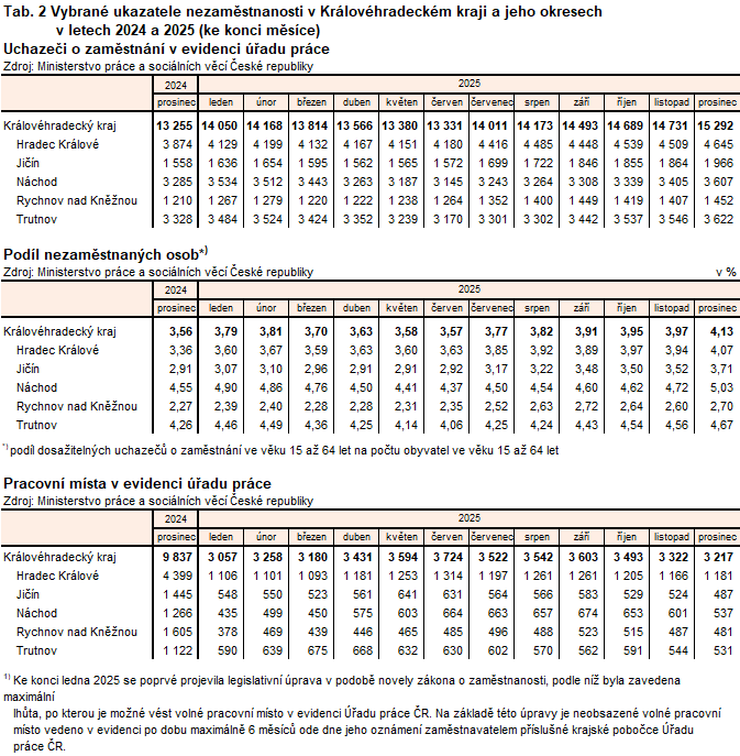 Úřady práce Královéhradeckého kraje evidovaly k 31. 12. 2025 celkem 15 292 uchazečů o zaměstnání, o 3,8 % tj. o 561 osob více než na konci předchozího měsíce. Meziměsíční nárůst počtu uchazečů byl zaznamenán ve všech okresech. Nejvyšší meziměsíční přírůstek vykázal okres Náchod o 5,9 %, tj. o 202 osob.