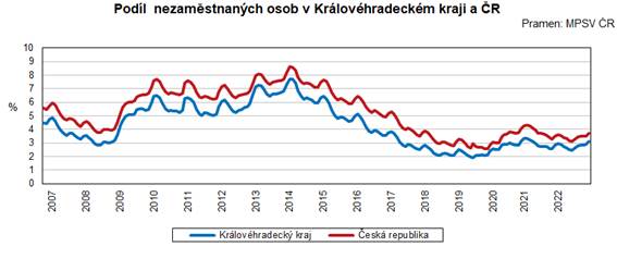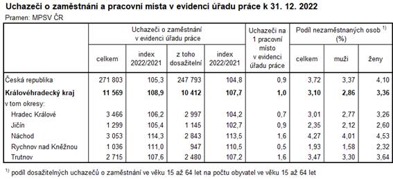 Úřady práce Královéhradeckého kraje evidovaly k 31. 12. 2022 celkem 11 569 uchazečů o zaměstnání. Meziměsíčně se počet nezaměstnaných osob zvýšil o 5,7 %, tj. o 625 osob. Obdobný trend byl ve všech okresech kraje, nejvýraznější nárůst zaznamenaly okresy Náchod (o 9,2 %, tj. o 258 osob) a Trutnov (o 5,0 %, tj. o 129 osob).