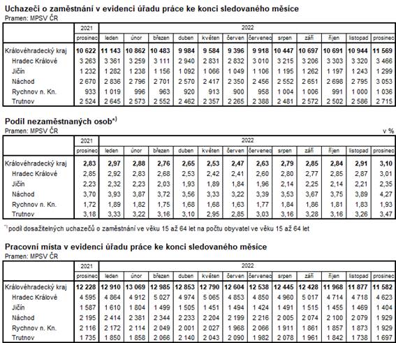 Ve srovnání s prosincem 2021 se počet uchazečů o zaměstnání v kraji zvýšil o 8,9 %, tj. o 947 osob. Meziroční nárůst byl zaznamenán ve všech okresech kraje, největší navýšení bylo v okresech Náchod o 14,3 %, tj. o 383 osob, Rychnov nad Kněžnou o 11,0 %, tj. o 103 osob a Trutnov o 7,6 %, tj. o 191 osob. V okresech Hradec Králové a Jičín vzrostl počet uchazečů o 6,2 %, tj. o 203 osob, resp. o 5,4 %, tj. o 67 osob.