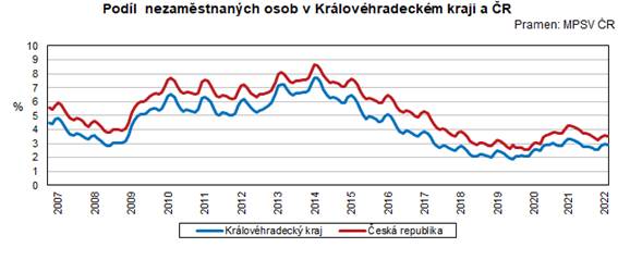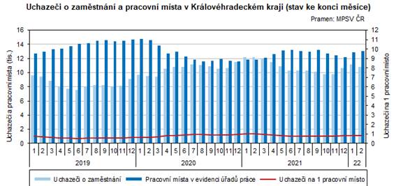Úřady práce Královéhradeckého kraje evidovaly k 28. 2. 2022 celkem 10 862 uchazečů o zaměstnání, tj. meziměsíční pokles o 281 osob. Obdobný trend byl zaznamenán ve všech okresech kraje, v porovnání s minulým měsícem vykazovaly nejvýraznější relativní pokles počtu uchazečů o zaměstnání okresy Jičín (o 3,4 %, tj. o 44 osob) a Hradec Králové (o 3,0 %, tj. o 102 osob).