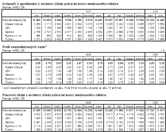 Ve srovnání s únorem 2022 se počet uchazečů o zaměstnání v kraji zvýšil o 12,7 %, tj. o 1 384 osob. Meziroční nárůst byl zaznamenán ve všech okresech kraje, nejvíce v okresech Náchod o 17,8 %, tj. o 499 osob, Hradec Králové a Rychnov nad Kněžnou shodně o 12,4 %, tj. o 405 osob, resp. o 124 osob. V okresech Trutnov a Jičín vzrostl počet uchazečů o 11,5 %, tj. o 296 osob, resp. o 4,8 %, tj. o 60 osob.