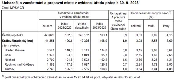 Úřady práce Královéhradeckého kraje evidovaly k 30. 9. 2023 celkem 11 354 uchazečů o zaměstnání. Meziměsíčně se jejich počet zvýšil o 1,4 %, tj. o 160 osob. Podobný trend byl ve všech okresech kraje, kromě okresu Náchod, kde byl pokles o 0,8 %, tj. o 21 osob. V porovnání s minulým měsícem zaznamenal nejvýraznější nárůst počtu uchazečů o zaměstnání okres Rychnov nad Kněžnou (o 9,6 %, tj. o 104 osob).